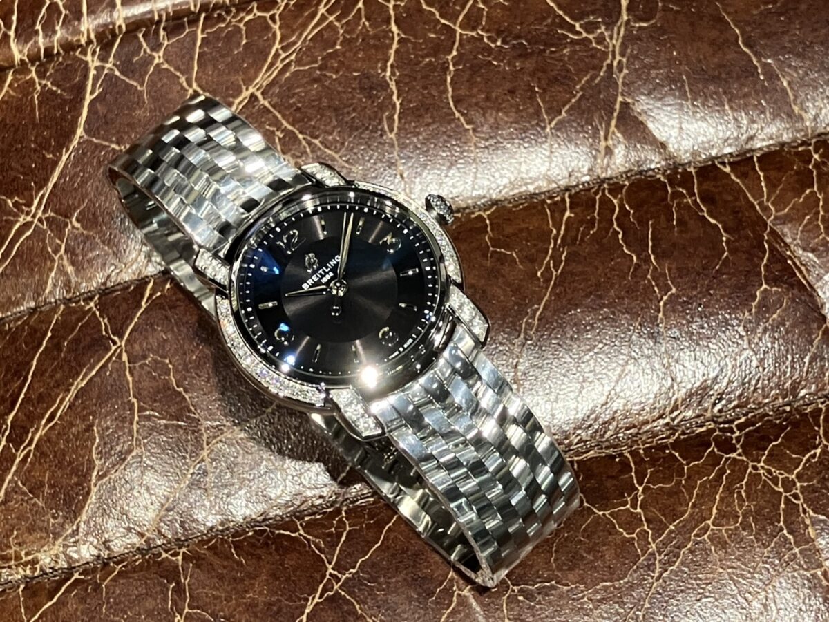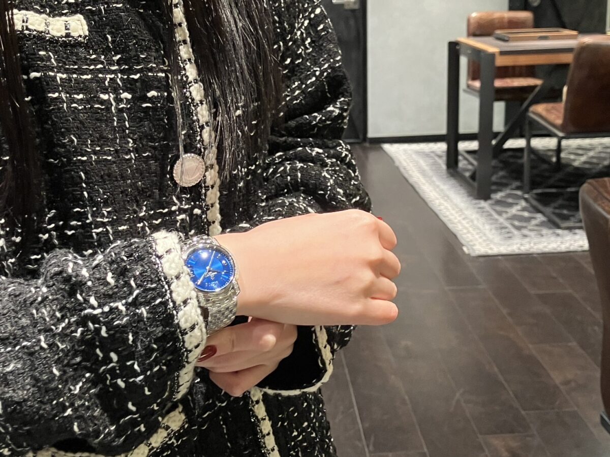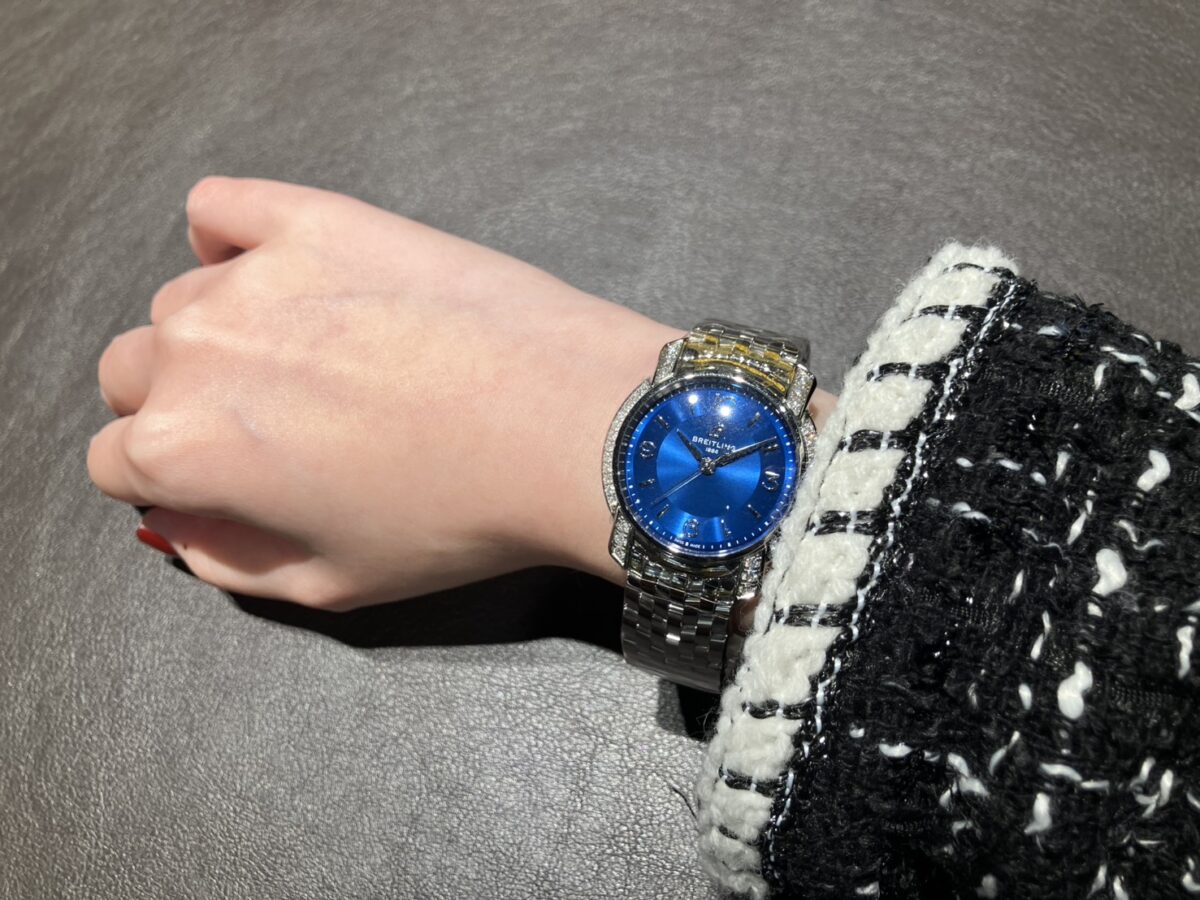 実際に入荷してきたばかりの「レディプレミエ32」を着用してみました!吸い込まれるようなブルーとブラックの文字盤です。この季節にはぴったりの寒色系のお色はダイヤモンドと相性抜群なのです。寒空の下で輝くダイヤモンドは一段と美しさを倍増させます。大きさは32mmで、小さすぎず、しっかりと存在感を出してくれます。お持ちのジュエリーとも合わせやすいデザインとカラーリングではないでしょうか。注目すべきは「ブレスレット」です。新しくデザインされた「V字型」のブレスレットは細やかで繊細。腕元できらっと輝きます。ブライトリングのレディース腕時計の新たな特徴となるでしょう。