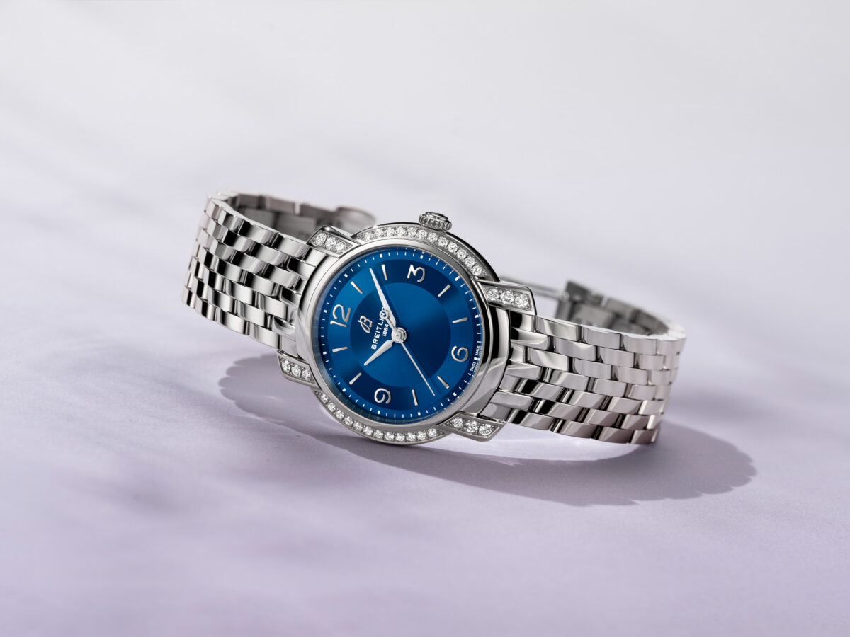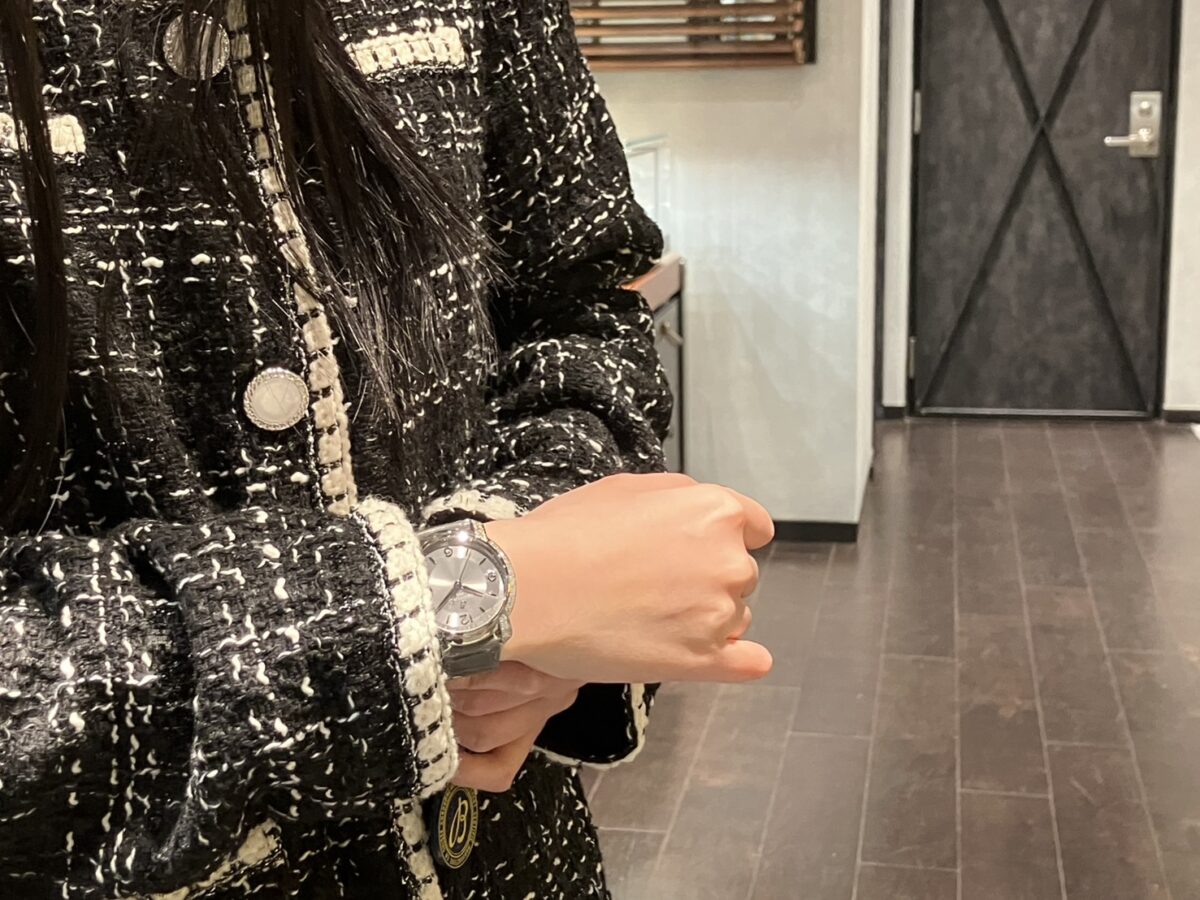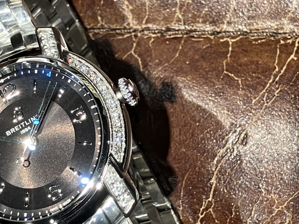 実際に入荷してきたばかりの「レディプレミエ32」を着用してみました!吸い込まれるようなブルーとブラックの文字盤です。この季節にはぴったりの寒色系のお色はダイヤモンドと相性抜群なのです。寒空の下で輝くダイヤモンドは一段と美しさを倍増させます。大きさは32mmで、小さすぎず、しっかりと存在感を出してくれます。お持ちのジュエリーとも合わせやすいデザインとカラーリングではないでしょうか。注目すべきは「ブレスレット」です。新しくデザインされた「V字型」のブレスレットは細やかで繊細。腕元できらっと輝きます。ブライトリングのレディース腕時計の新たな特徴となるでしょう。