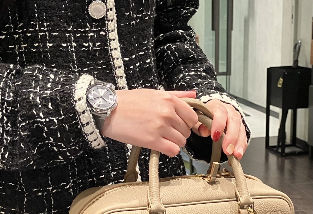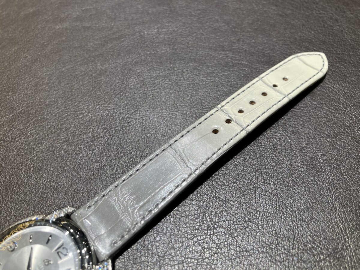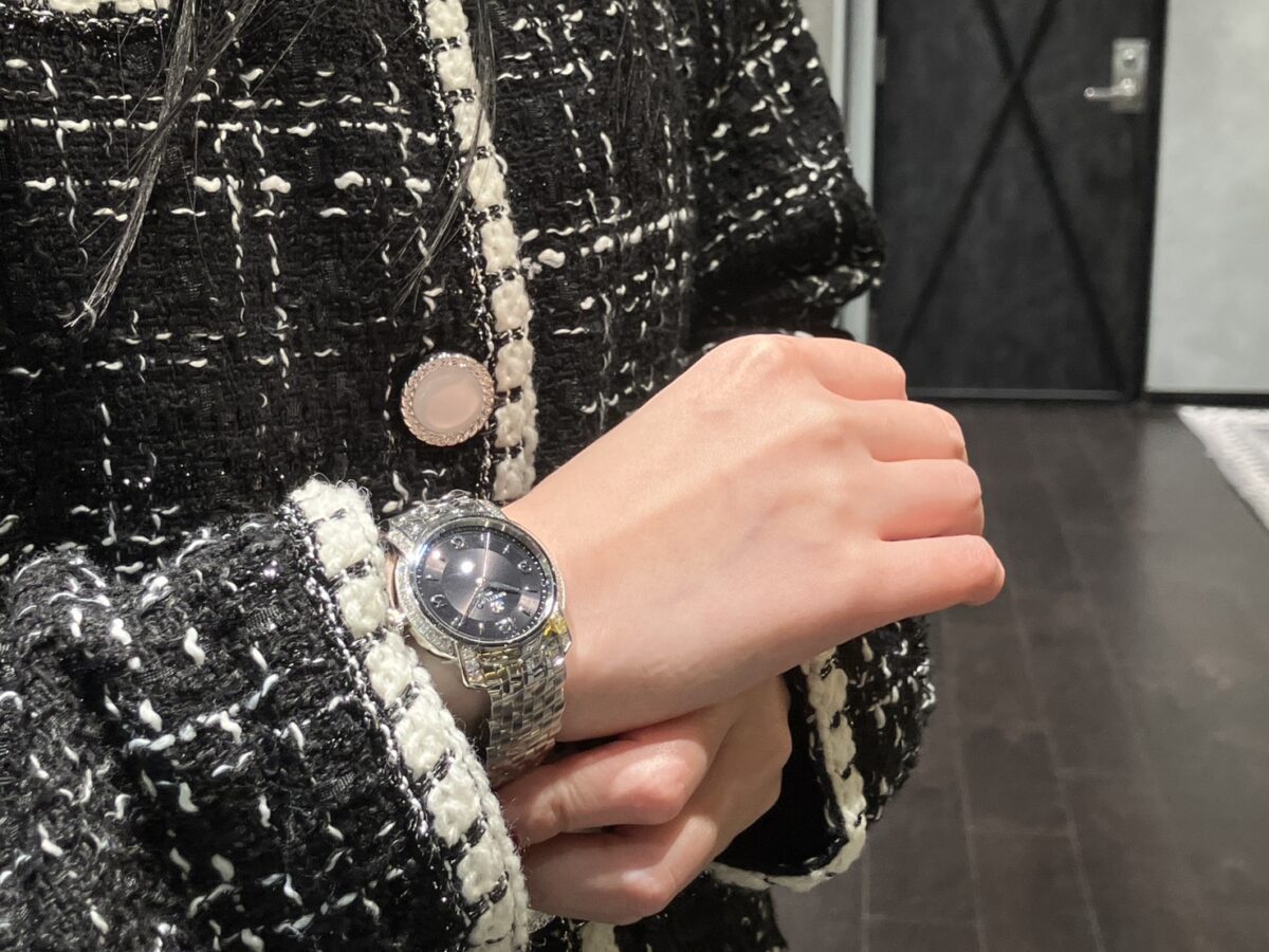 スタッフ一推しはこちらのグレーのお色です。黒でも白でもない中間色は海外のお客様にも人気のお色なのです。理由は「合わせやすい」です。上品なグレーはどんな服装にも溶け込んでくれます。また、はっきりとしたお色ではない分、自然と違和感なく腕元を華やかに魅せてくれます。この最強グレーにダイヤモンドが加わり、女性らしさが溢れるデザインとなりました。大きさは36mmの機械式時計ですが、無骨さはなく、柔らかい印象です。もちろんアリゲーターは「レディプレミエ」初のグラデーションです。鮮やかな色の移ろいを楽しむことができるのです。最高にオシャレだと思いませんか?🩶