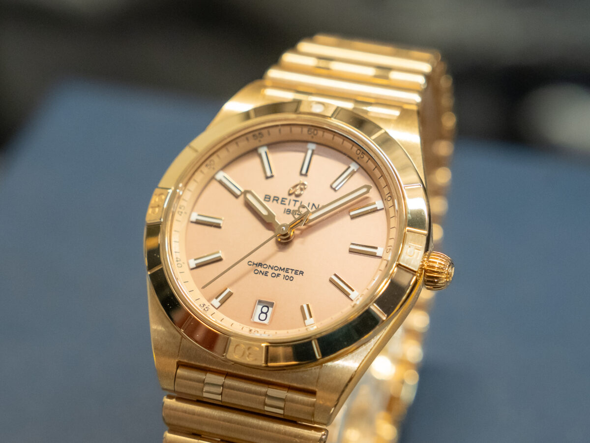 ブライトリングでは珍しくイエローゴールドを使用したこちらのモデル。実はデビッド・ベッカムの奥様でもあり、デザイナーのヴィクトリア・ベッカムとのコラボレーションモデルです。100本限定のこの特別すぎるモデルは36mmでジェンダーレスなデザインです。ブライトリングは他ブランドに比べてゴールドを使用している量が多いことでも有名です!