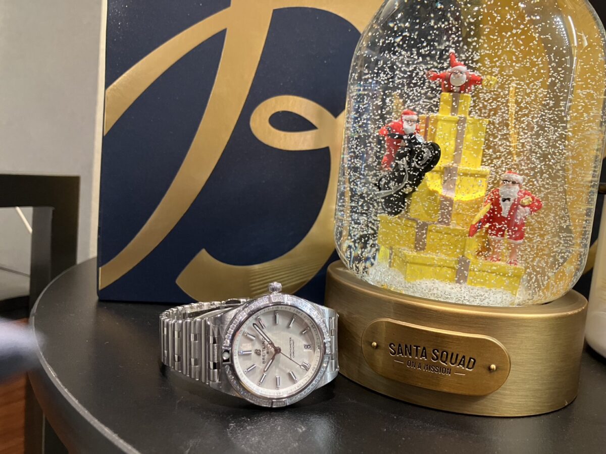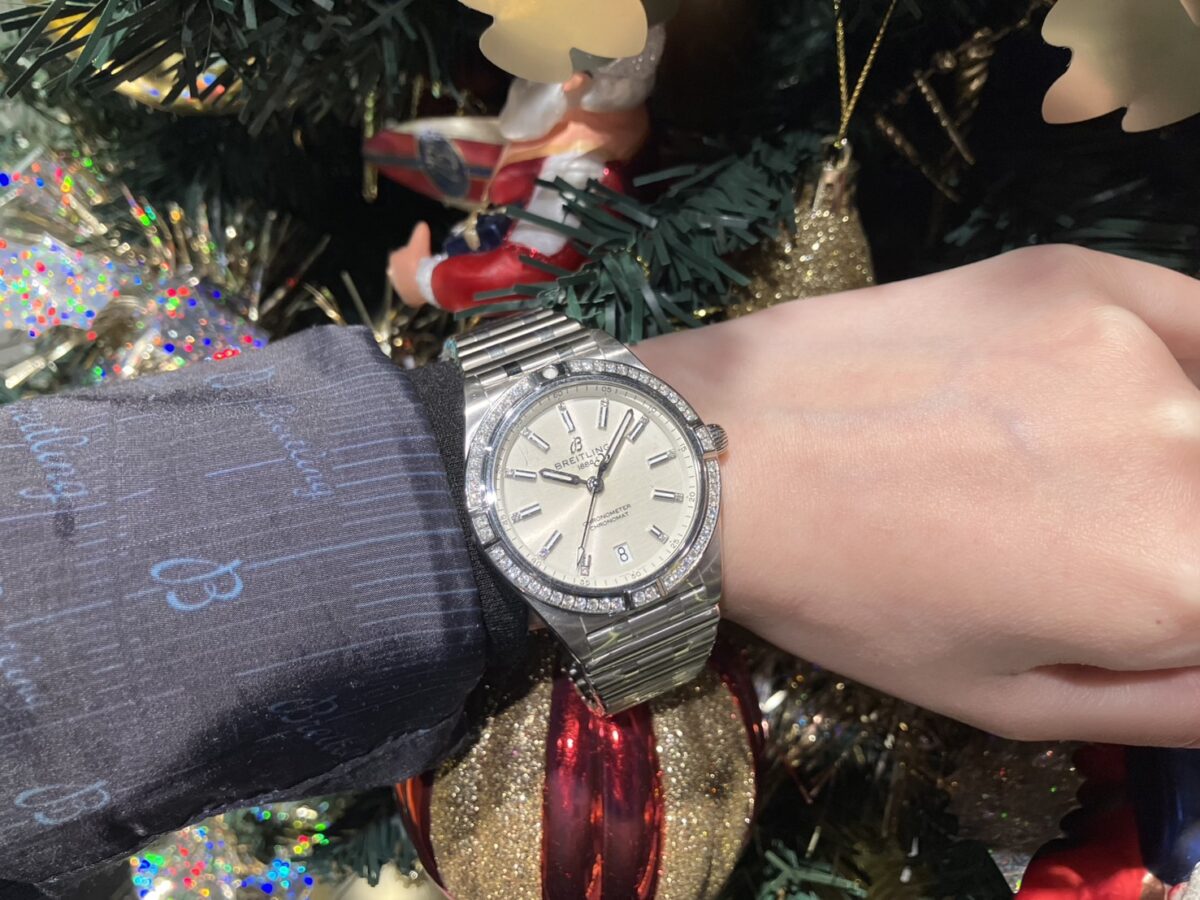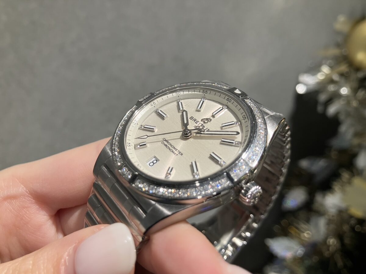 ダイヤモンドの輝きが眩しい「クロノマット36」。36mmはクォーツではなく、オートマチックです。時計ブランドのお時計だからこその安心感です。防水も100mあるので自宅で洗うことも可能なくらいです。この季節ならではでもある「雪」を彷彿とさせるような真っ白な文字盤とダイヤモンドがとても美しいです。