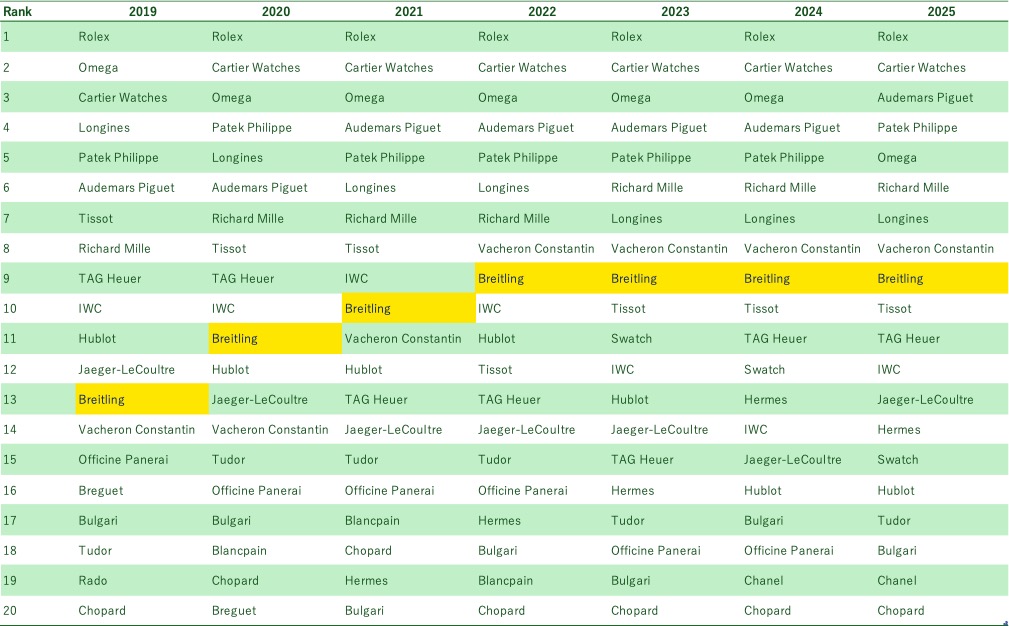 かつてロレックスと熾烈なランキング争いを繰り広げていたオメガは、今回 5 位まで順位を落とす結果 に。