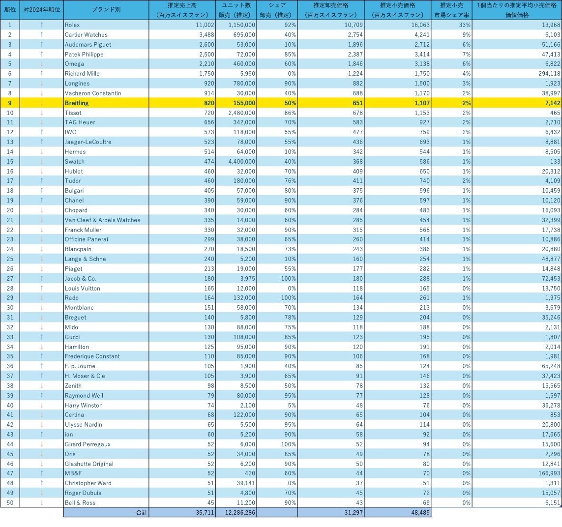 ※参考資料:Morgan Stanley × LuxeConsult“Top 50 Swiss Watch Brands 2025”Monochrome Watches掲載データをもとに作成