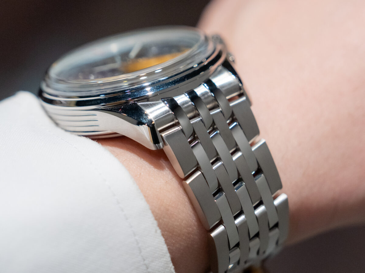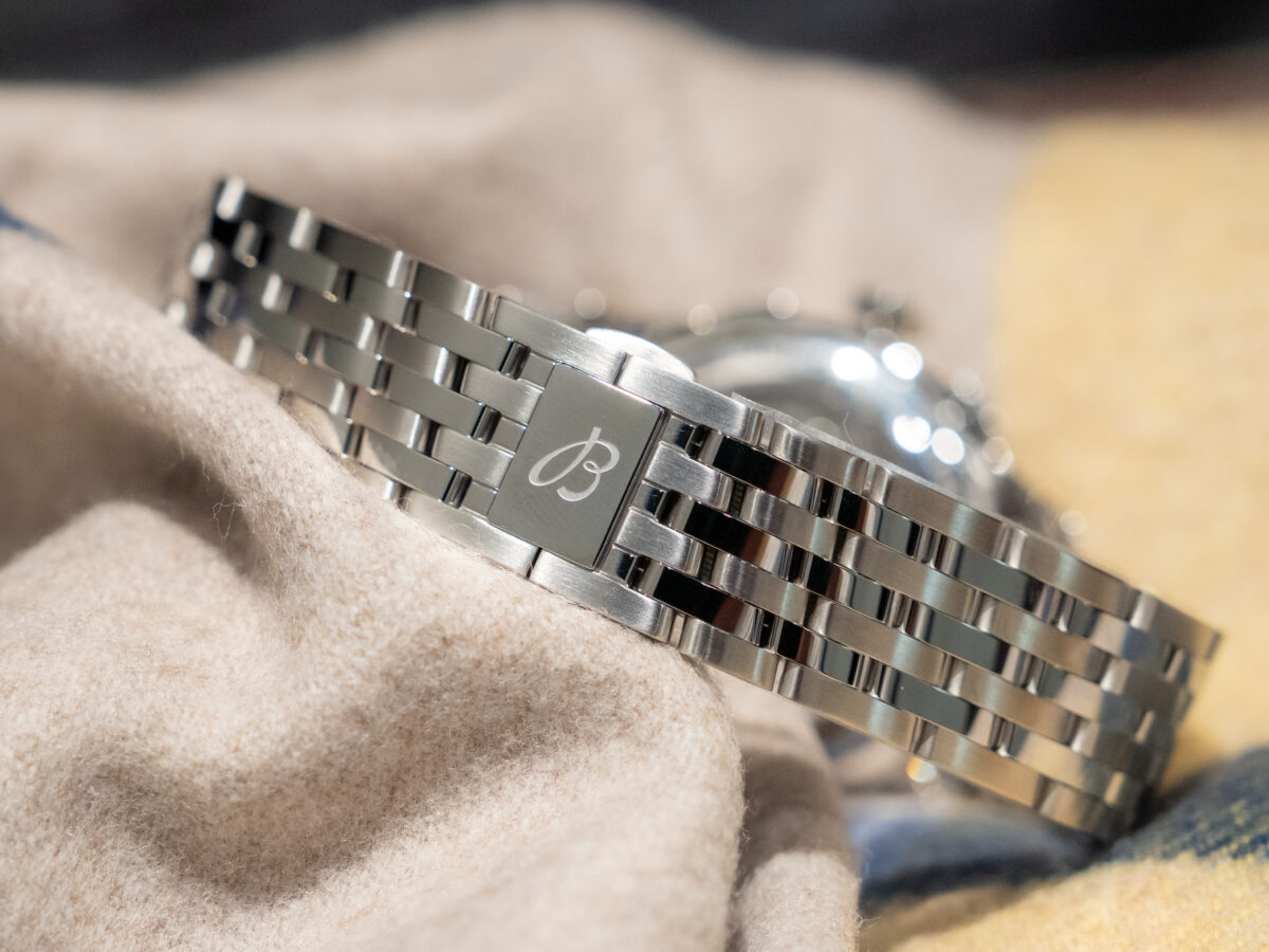 ブレスにもご注目ください。細やかな7連ブレスとなっており、とてもしなやかです。サテン仕上げとポリッシュ仕上が交互になっているのでより立体的に映ります。遠目から見てもブライトリングと腕時計と認識できるブレスレットです。よく傷や汚れを心配なさるお声を耳にしますが、ブティックではクリーニングを無料で行っております。クリーニングは超音波洗浄ですので、普通に洗うよりもピカピカに仕上がります。