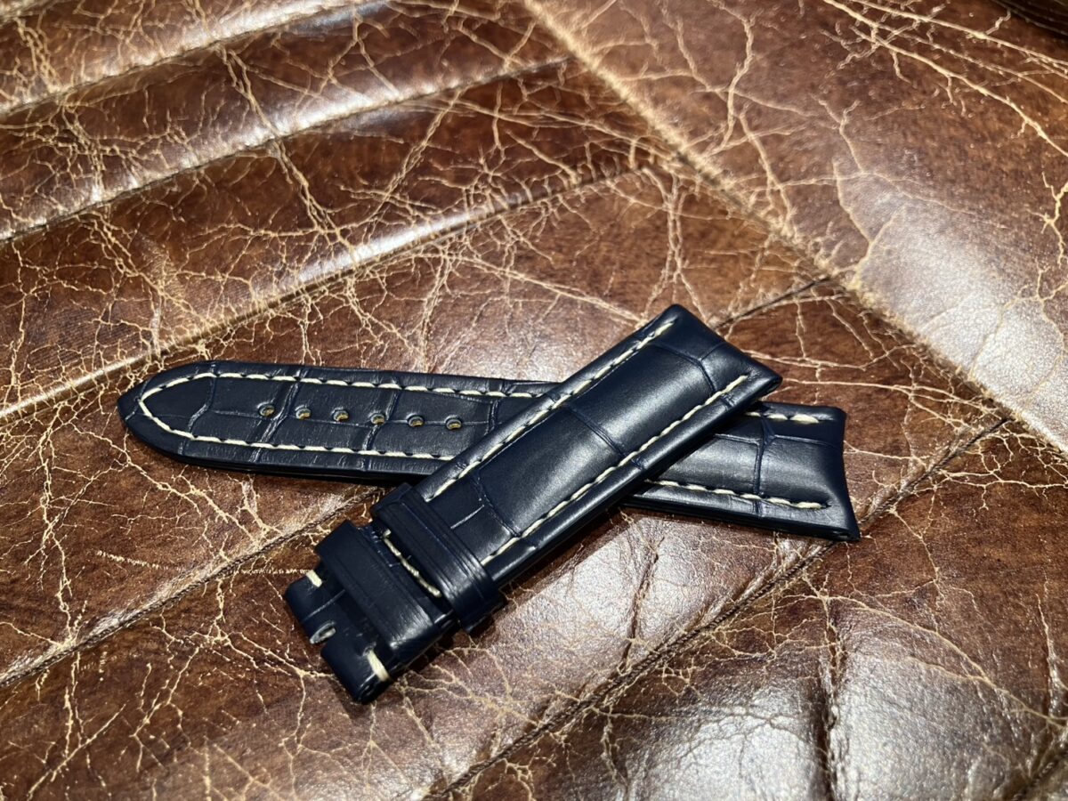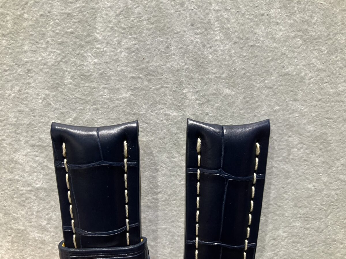 もちろん、革ベルトに付け替えも可能です。茶色い革ベルトに付け替えると、上品さが格段に上がります。革ベルトにも色々種類がございます。プレミエのストラップの特徴はラグの部分がラウンド型になっていることです。プレミエ専用のストラップとなります。今回は掲載しているベルトは文字盤と合わせたブルーカラーです。他にもブラウン、ブラックなど定番のカラーもご用意しておりますので、お気軽にご相談いただければと思います。